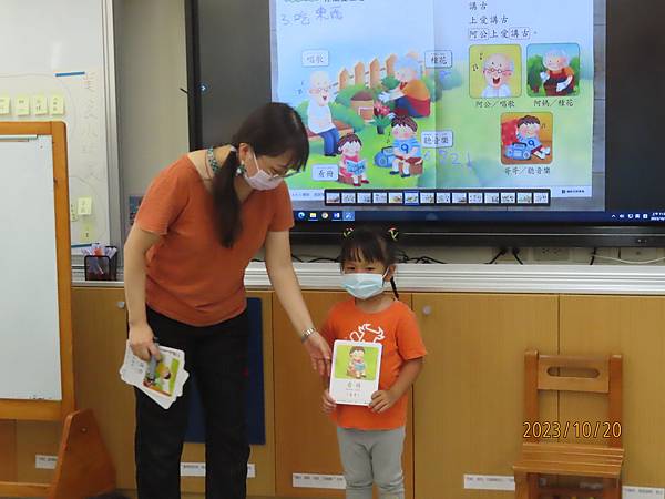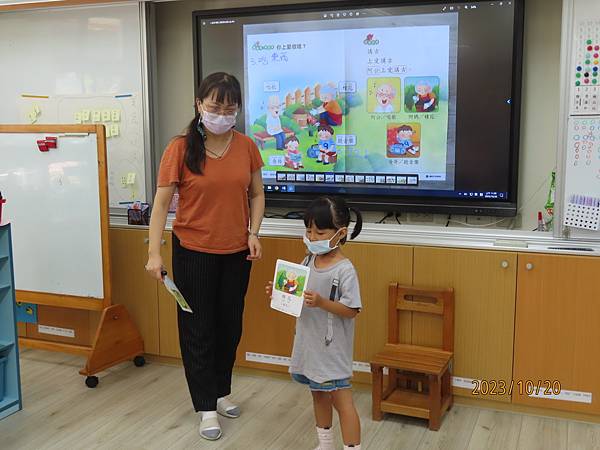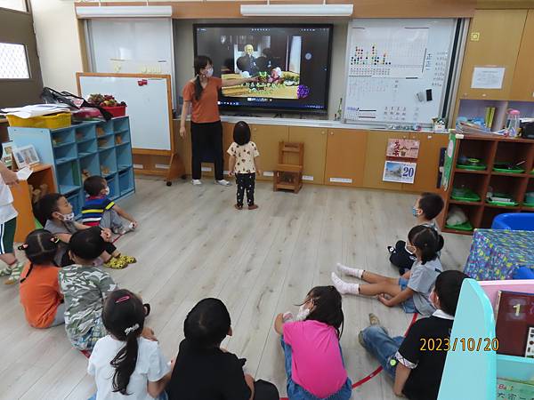 大家依海報上的項目來說自己喜歡做的事,不過,有一大班小孩提出不同的項目「喜歡吃東西」,老師給予口頭讚賞~